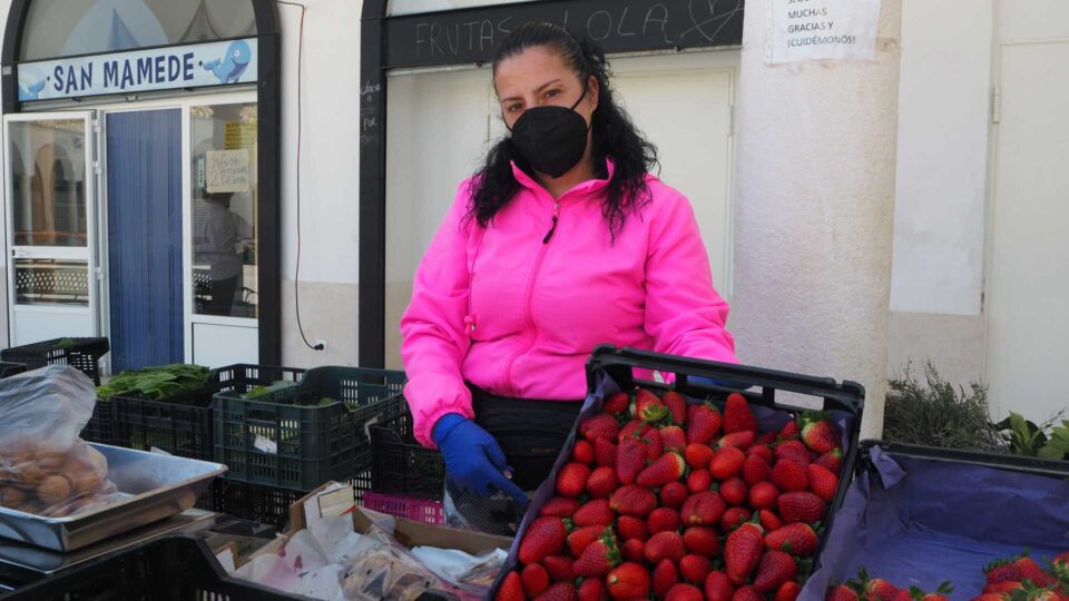 Y en el centro, encontramos el puesto de Lola, grandes mesas de madera albergan un sinfín de frutas y verduras que trae de Puente Genil y Aguadulce. Desde los 12 años al resguardo de las plazas, ahora con 44 no para de reinventarse. Nos cuenta que durante el confinamiento domiciliario del año pasado, sus clientes tenían miedo de acudir al mercado y tuvo que empezar a repartir a domicilio para seguir con un negocio que lleva sola.