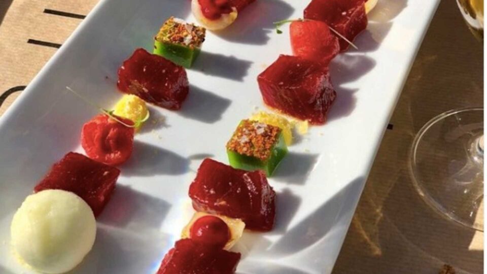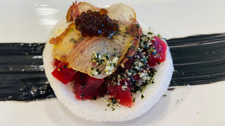 Gonzalo Jurado es un apasionado de este manjar marino y cada año es de los primeros que recibe el producto fresco para interpretarlo en su cocina. Este año las recetas que elabora con él son guiso de parpatana, o una tosta crujiente con aires mexicanos que fusiona el atún con guacamole. También descargamento de atún rojo de almadraba aliñado al momento en contrastes, con gominola de albahaca y especias japonesas, maíz dulce, cebollas encurtidas, romescu de remolacha y sorbete de manzana-lima y jengibre.