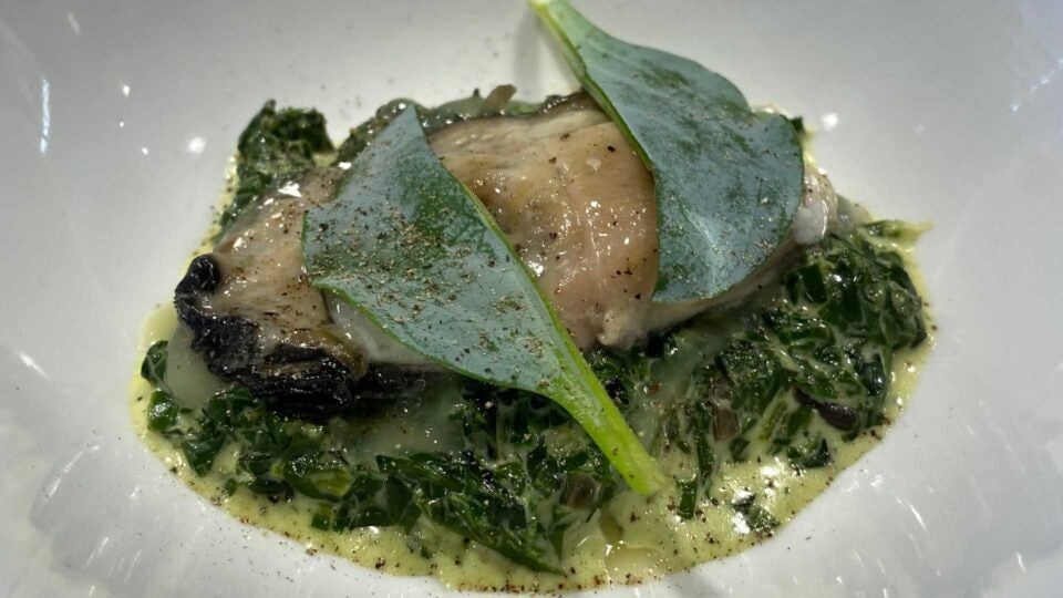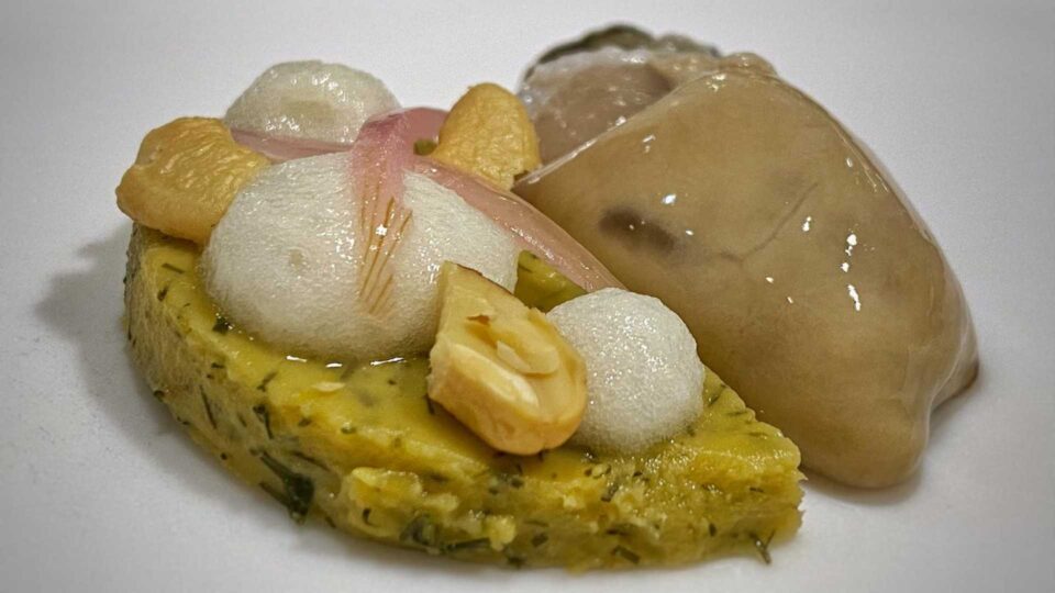 El único restaurante de Sevilla con estrella Michelin trabaja producto de alta gama y la ostra encuentra su sitio en la cocina de Julio Fernández Quintero. La prepara con cremoso de maíz y eneldo, manzana y anacardo.