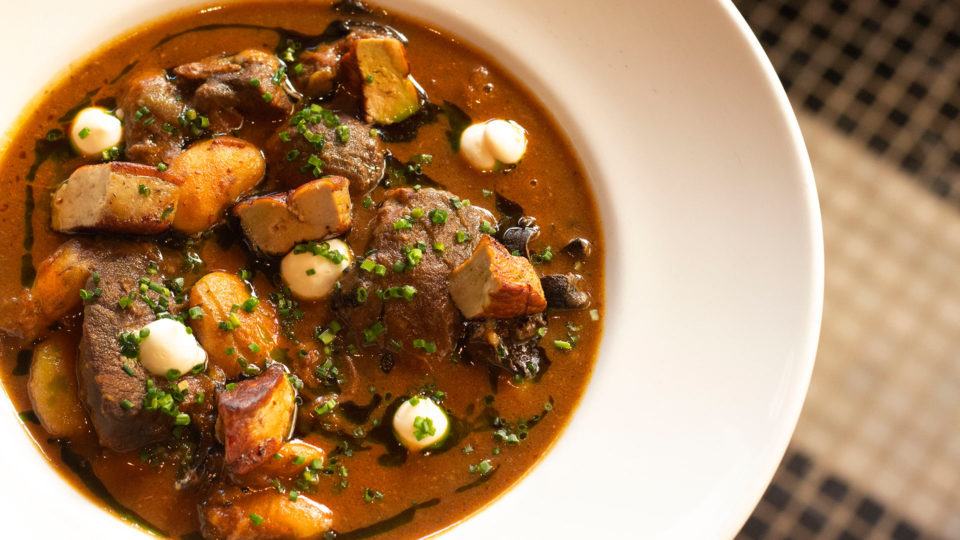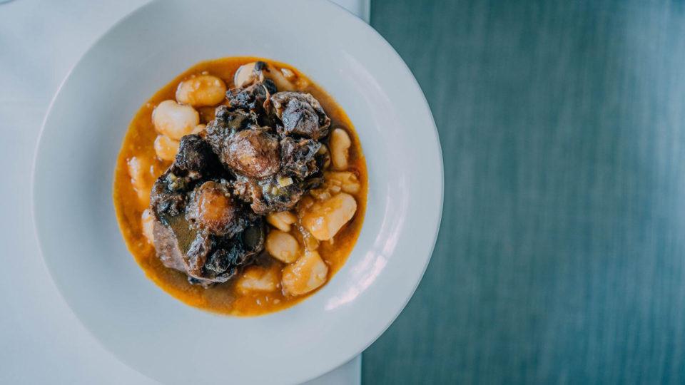 Guiso de jabalí con judiones, setas y foie de Castizo