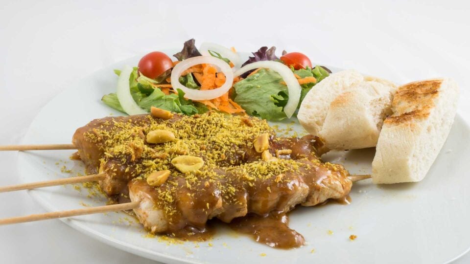 Pinchito de pollo saté o bamischijf (croquetas rellenas de tallarines chinos) son otras de las especialidades de la carta, sin dejar atrás sus nasi goreng con pinchito saté, huevo frito y atjar .