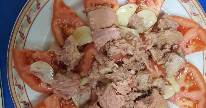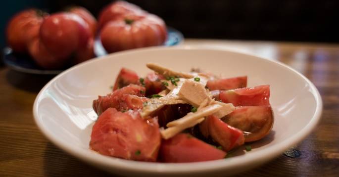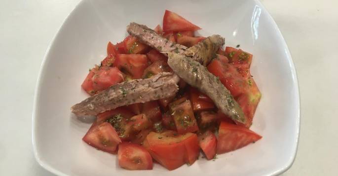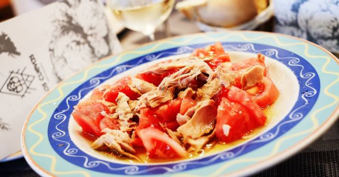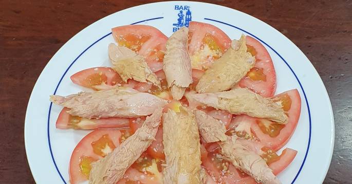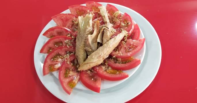 En Bodega Vargas sirven un tomate cortado en cuartos y laminado, que distribuyen con maestría en el plato y que se aliña con sal gruesa, vinagre y una picada de ajo, perejil y un buen aceite de oliva virgen extra. Se remata con melva canutera por encima.