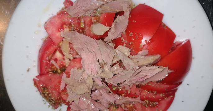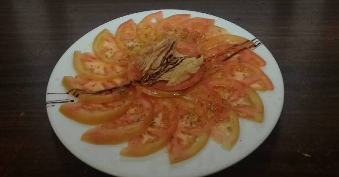 En este clásico de El Porvenir que hace poco estrenaba nueva etapa de la mano de Felipe Molina encontramos un buen tomate rojo aliñado con un buen aceite (Conde de Argillo), vinagre de Jerez, sal y un poco de orégano. Rematan el plato con unos lomitos de melva.