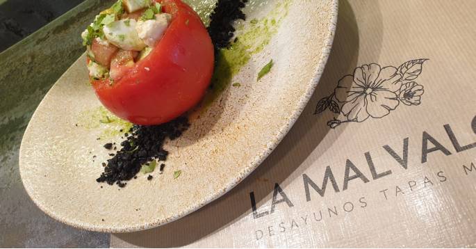 En La Malvaloca dan un giro a la presentación tradicional y sirven tomate ecológico relleno de mozarella con aceite de albahaca y arena de aceitunas negras, una peculiar presentación donde el tomate hace las veces de cuenco.