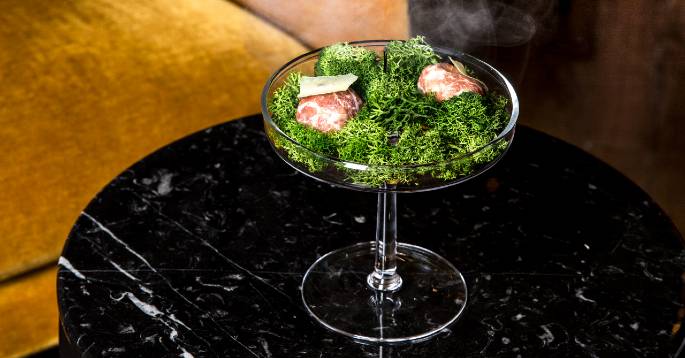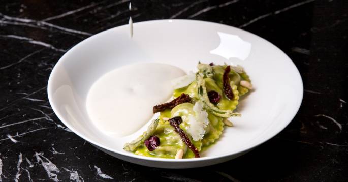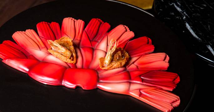 Entre los entrantes se encuentran recetas como tomate de Los Palacios con burrata, kalamata y albahaca, ajo blanco y ajo negro (anguila ahumada y manzana), ravioli de gamba al ajillo y azafrán o pulpo tupinambo con amontillado y mojo.