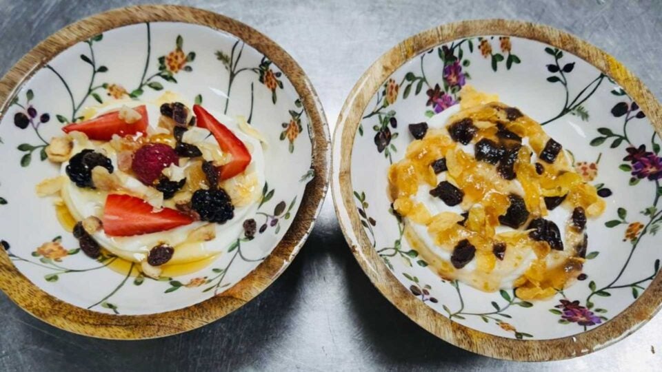 El festín continúa con una de las siguientes opciones: yogur griego con melaza de frutas, ciruelas pasas y cereales o quark con miel, fruta natural y granola.