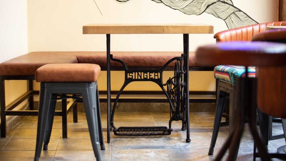 Las mesas son antiguas Singer reformadas y la pared de ladrillo visto atesora cientos de monedas apoyadas entre ladrillo y ladrillo.