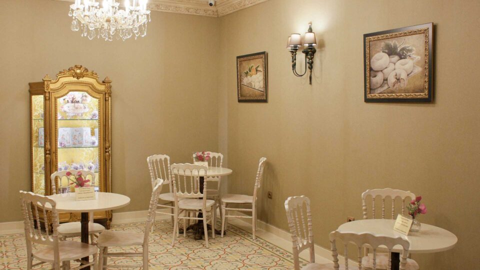 El nuevo establecimiento es amplio y acogedor, un espacio donde la iluminación juega un papel importante y el ambiente invita a relajarse. La línea clásica de la decoración sigue la filosofía del grupo, que cuida desde el uniforme de las camareras a los pequeños detalles de cada vitrina. Solería de losa hidráulica, lámparas de araña y una amplia barra de mármol y madera son los elementos principales del local.