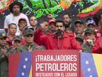 21:55: Imagen del discurso que ha dado Maduro ante los manifestantes en apoyo a la Revolución Bolivariana. Maduro ha cuestionado la legitimidad de López, que apenas contaría con el aval de «400.000 votos»
