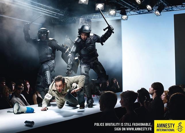 amnistía internacional Los excesos policiales están siempre sobre el tapete, no solo en los países donde las libertades están fuertemente restringidas, sino incluso en las democracias más «ejemplares del mundo», como las europeas. En España, especialmente en Cataluña, ha sido tema de debate en los últimos tiempos el uso de la fuerza por parte de los Mossos d'Esquadra. En este cartel se lee: «La bruatlidad policial está aún de moda».