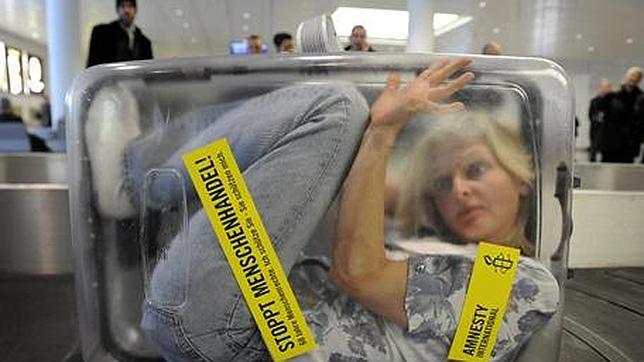 amnistía internacional Una mujer atrapada dentro de una maleta transparente en una cinta de un aeropuerto. Es la manera que tiene esta ONG de denunciar el tráfico humano, que es sufrido especialmente por mujeres que son víctimas de proxenetas en todo el mundo. En la maleta, se puede leer una pegatina que reza «Para el tráfico de personas».