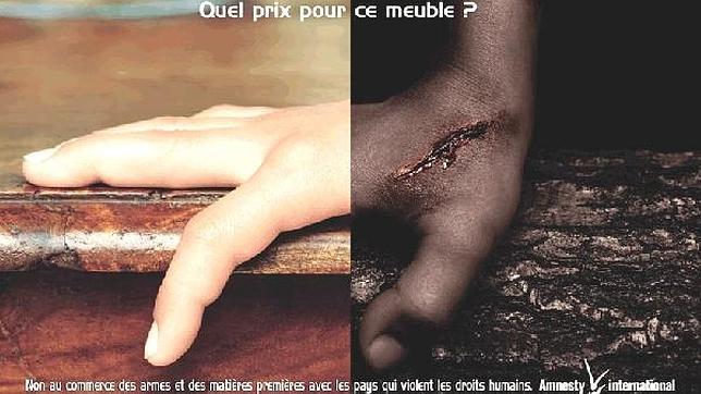 amnistia internacional «Qué precio por ese mueble?» se lee sobre esta foto en la que una mitad muestra una mano blanca sobre una mesa de madera y otra, una mano negra, sangrando, sobre un tronco de madera. «No al comercio de armas y materias primas con países que violan los derechos humanos» es el mensaje que comunica esta campaña.