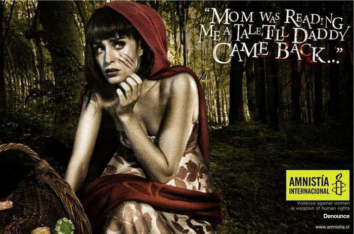 amnistía internacional Esta es probablemente una de las imágenes más impactantes de las campañas llevadas a cabo por Amnistía Internacional en su lucha por acabar con la violencia contra la mujer. En ella, se observa a una caperucita roja con rasguños en la mejilla y con expresión de miedo en su rostro. La angustia de esta caperucita no se debe al lobo feroz, sino a un padre que no es tan cariñoso como en las historietas infantiles. En la parte superior se puede leer «Mamá estaba leyéndome un cuento hasta que papá regresó».