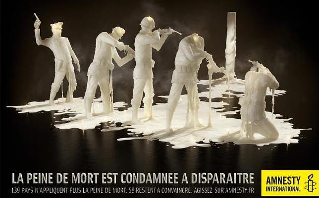 amnistía internacional Un pelotón esperando la orden para disparar y ejecutar a un hombre se derrite. Las figuras hechas de cera se deshacen y de esa manera se da el mensaje de que « la pena de muerte está codnenada a desaparecer». En la parte inferior de la imagen también se lee: «139 países ya no aplican la pena de muerte. 58 aún no se han convencido. Apoye a Amnistía».