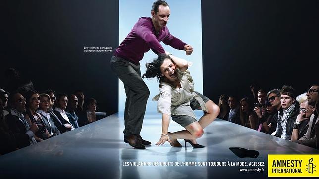 amnistía internacional «La violencia doméstica, colección otoño-invierno» y «las violaciones de los derechos humanos están aún de moda» son las frases que acompañan una imagen en la que un hombre golpea a una mujer en una pasarela, ante la mirada de los asistentes al «desfile».