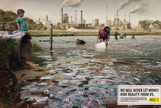 AMNISTÍA INTERNACIONAL El mundo de hoy se mueve por intereses, y eso lo tiene claro Amnistía Internacional. Por eso, con esta imagen –en la que niños buscan agua en un lago lleno de billetes y contaminado por residuos industriales–, buscan dejar claro que son independientes ante aquellos que les son ajenos. «Nunca dejaremos que el dinero esconda la realidad de nosotros» y «rechazamos el dinero de las grandes corporaciones y los gobiernos», son su manera de dejar clara su autonomía. «Nuestras acciones son financiadas solo con tus donaciones», aseguran.