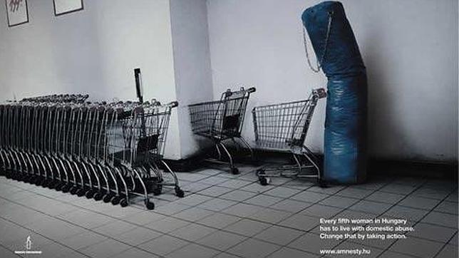amnistía internacional En esta campaña llevada a cabo en Hungría, la organización optó por un saco de boxeo llevando el carrito de la compra para representar los abusos a los que son sometidas muchas mujeres en ese país. En la parte inferior de la imagen, se puede leer «Una de cada cinco mujeres en Hungría tiene que vivir con violencia doméstica. Cambia esa situación tomando medidas».