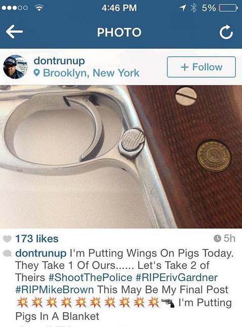 Tres horas antes de actuar, Brinsley publicó en la red social Instagram dos fotografías en las que podía verse entre otras cosas una pistola junto a mensajes dando a entender su intención de asesinar a dos policías a modo de venganza.