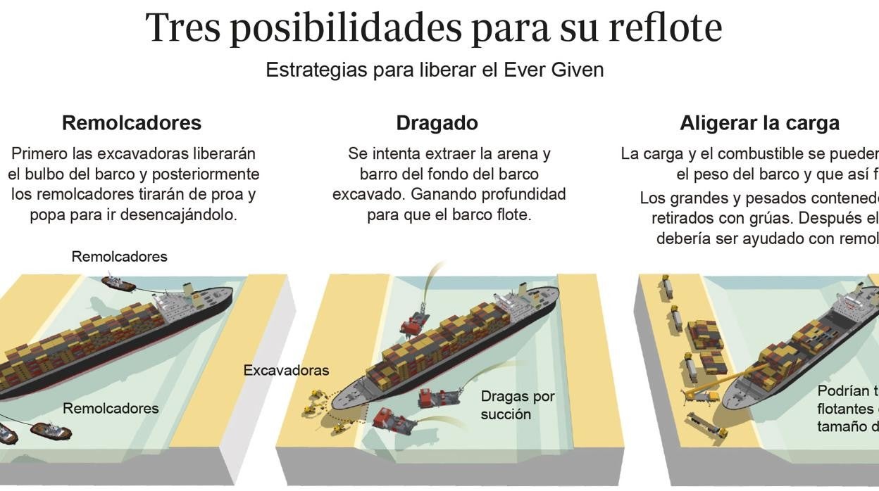 Primero las excavadoras liberarán el bulbo del barco y posteriormente los remolcadores tirarán de proa y popa para ir desencajándolo.