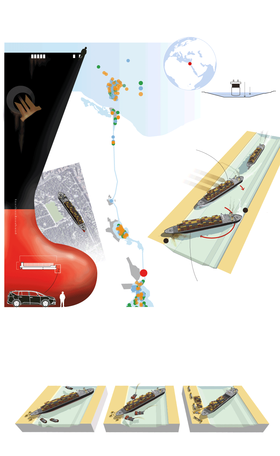 La nave Ever Given choca contra uno de los lados del canal incrustando el bulbo (parte delantera y sumergida de algunos barcos) en la orilla (a). El buque, cono los motores encendidos todavía, comienza a girar apoyado en la tierra hasta encajarse en la otra orilla del canal (b).