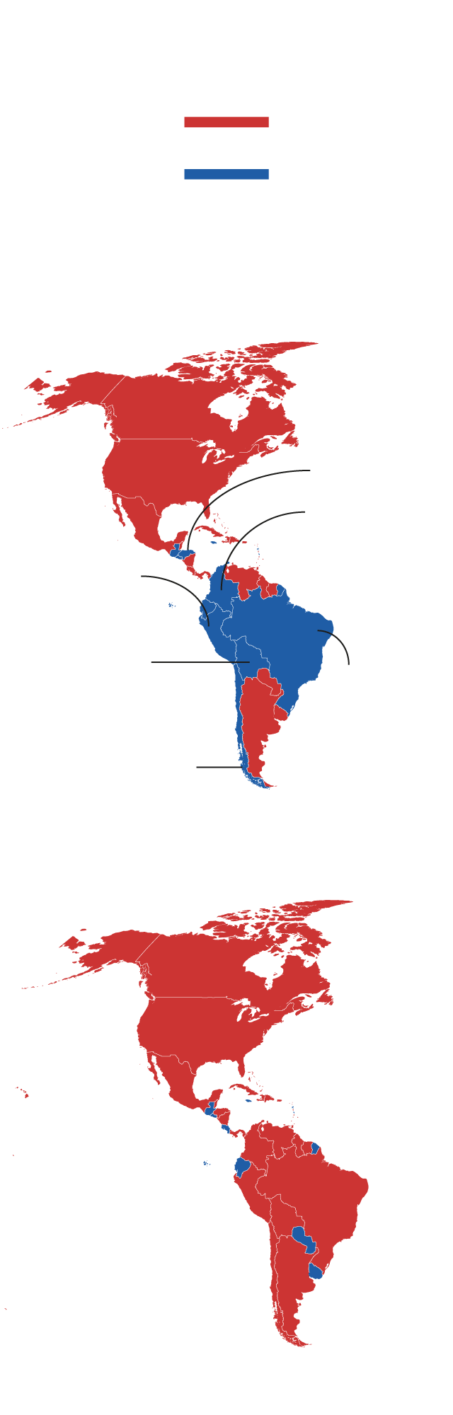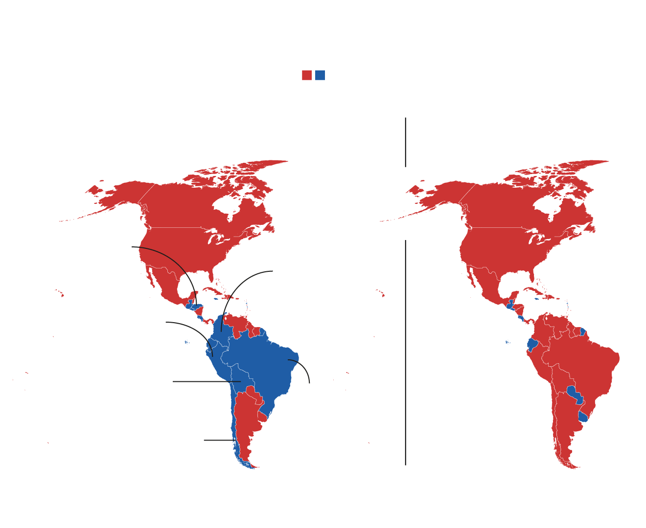 De Canadá a Chile, recorriendo el espinazo montañoso de las Rocosas y los Andes, América es de izquierdas, considerando esta opción no como un todo homogéneo, pues nada tienen que ver Trudeau y Biden con Maduro y Ortega. Desde posiciones de centro izquierda hasta dictaduras populistas, el abanico es mucho más complejo que lo que muestra el mapa que mostramos aquí.