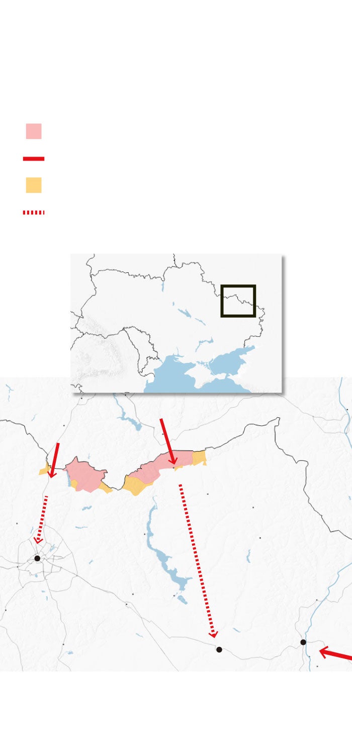 Por novedoso, resulta particularmente interesante el esfuerzo A). Se materializa, en un frente de alrededor de 60 kilómetros, por dos ejes de progresión: (1) Belgorod―Járkov, al este de la carretera E 105, donde las tropas rusas han logrado profundizar en terreno ucraniano hasta Liptsy (cerca de 10 km desde la frontera); y (2) Belgorod―Shebekino―Shevchenkove, donde han sido detenidas en Vovchans'k, 3 kilómetros tras la frontera. El eje 1, aunque por la importancia del objetivo (Jáarkov) parecería ser el principal, difícilmente podría serlo puesto que está alimentado solo por una fuerza de entidad divisionaria que, por sí misma, no sería capaz de llegar hasta Járkov. No obstante, sí resulta suficiente para lograr tres pretendidos efectos.