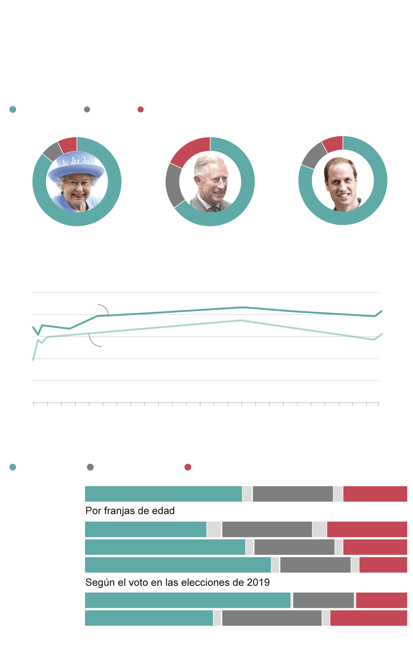 «Es posible que en un momento convulso como el actual, y como primera reacción tras la muerte de su madre, Carlos III logre el apoyo puntual de la mayoría de los británicos. Pero no es un cheque en blanco: si pretende seguir en el puesto hasta el final, tal y como su madre ha hecho con éxito, tiene que esforzarse. Y mucho», plantea José Pablo Ferrándiz, director de Opinión Pública y Estudios Políticos de Ipsos. «De él depende en gran medida que ese apoyo se mantenga y vuelva a los índices que ahora conocemos. Hay que pensar, además, que llega en mitad de una crisis de liderazgo nacional, con un reciente cambio de primer a primera ministra que tampoco goza del apoyo mayoritario de la ciudadanía».
