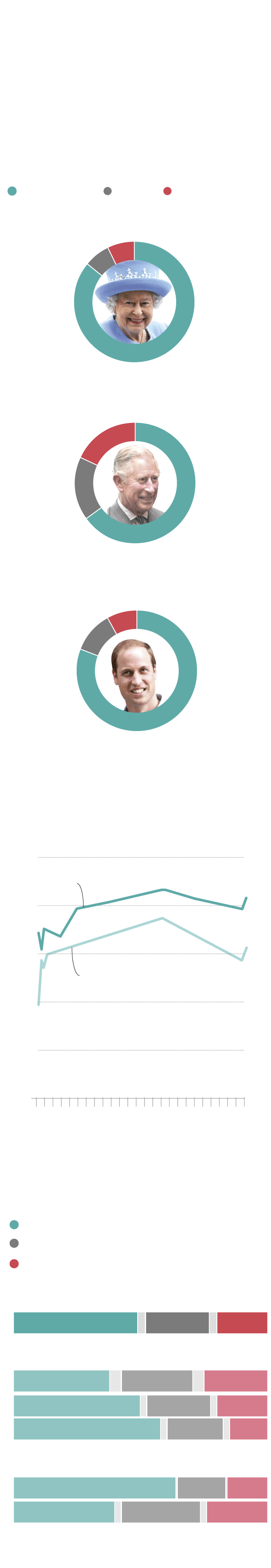 Más allá de la valoración de cada uno de los miembros de la Corona, los británicos no dudan de que la institución tiene presente y futuro. El 68 por ciento de los ciudadanos de Reino Unido manifestaban su apoyo a la Monarquía, y solo el 22 por ciento preferirían vivir en una república. Un 45 por ciento creen que al país le iría peor si se aboliese la Monarquía, un porcentaje que se redujo entre mediados de los ochenta, cuando alcanzaba casi un 80 por cierto, y los noventa. Hace cuatro meses, el 33 por ciento consideraban que la forma del Estado es indiferente. Solo el 13 por ciento estimaban que les iría mejor sin reyes.