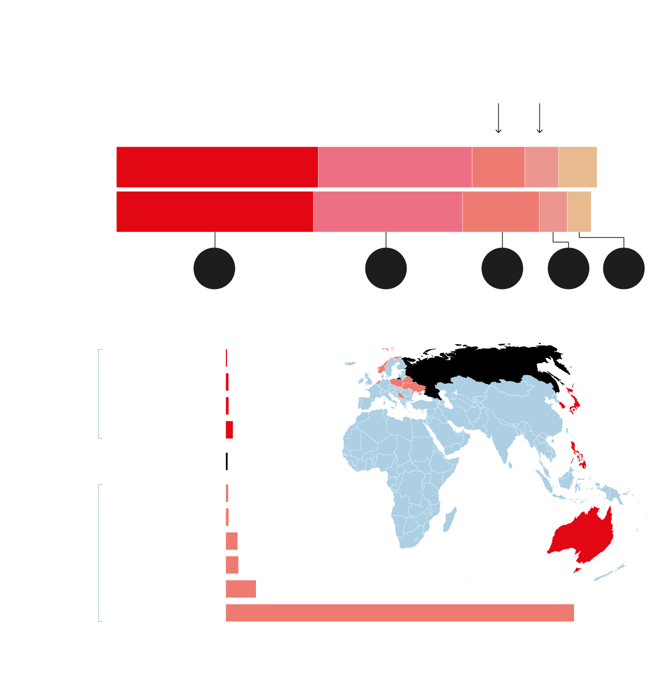 Y es digno de mención que, a pesar de su disminución en las exportaciones, Rusia todavía tiene un aumento significativo (39%) en las exportaciones realizadas solo a China, que por su parte compra armas especialmente a Corea del Norte. «En Asia Oriental se observa una competencia estratégica», añade Wezeman, «se refleja en la vista del mapa y especialmente las carreras de armamento en China y Corea del Norte, significativamente más importantes». La actual pesadilla de Occidente es la posibilidad de que China cambie de política y comience a vender armas a Rusia.