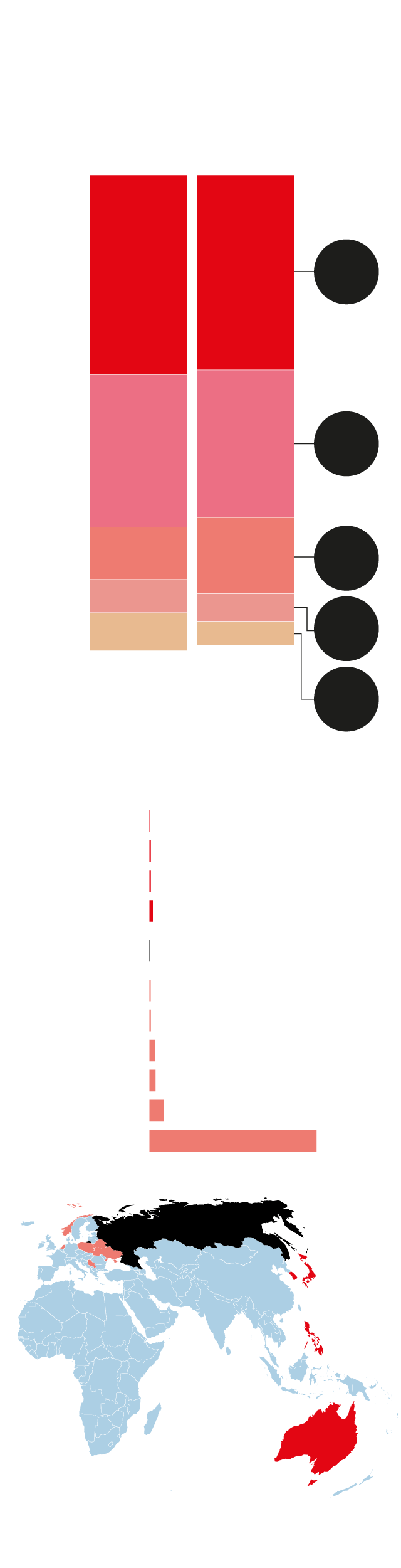 Los Estados de la OTAN en Europa aumentaron sus importaciones de armas en un 65% en comparación con los cinco años anteriores, «en respuesta a una mayor amenaza percibida desde Rusia». En lo que respecta a Europa, hay valores de aumento especialmente significativos en Holanda (307%), Noruega (285%) y Polonia (65 %). Fuera de la OTAN, Serbia y Bielorrusia en particular importaron significativamente más armas.