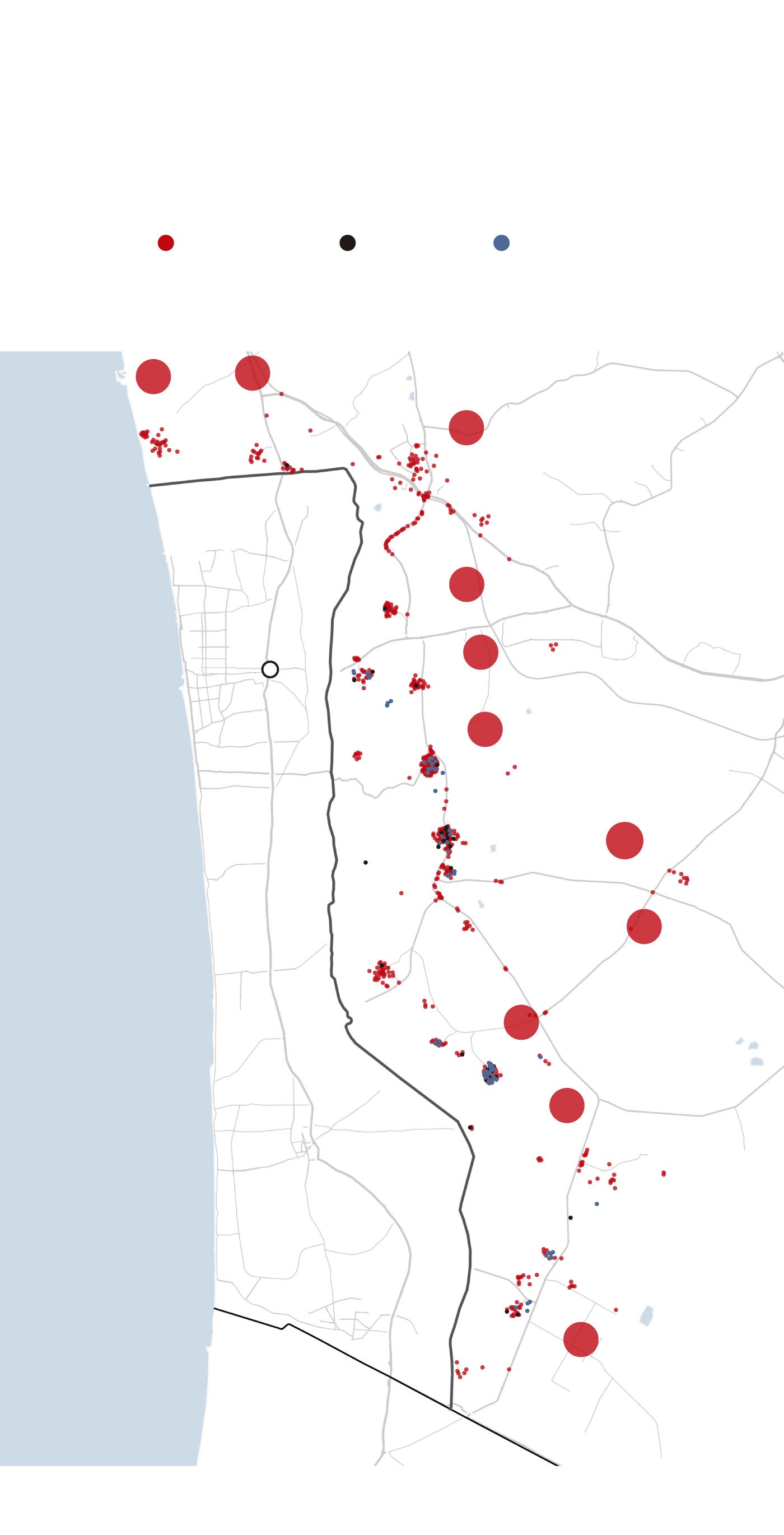 Los siguientes mapas muestran una evaluación integral basada en imágenes satelitales de los daños en las estructuras, vías de comunicación y cultivos dentro del área de la franja de Gaza. Los datos georreferenciados del UNOSAT (Centro de Satélites de la ONU) reflejan los resultados de cada edificio antes y después de las operaciones militares israelíes.