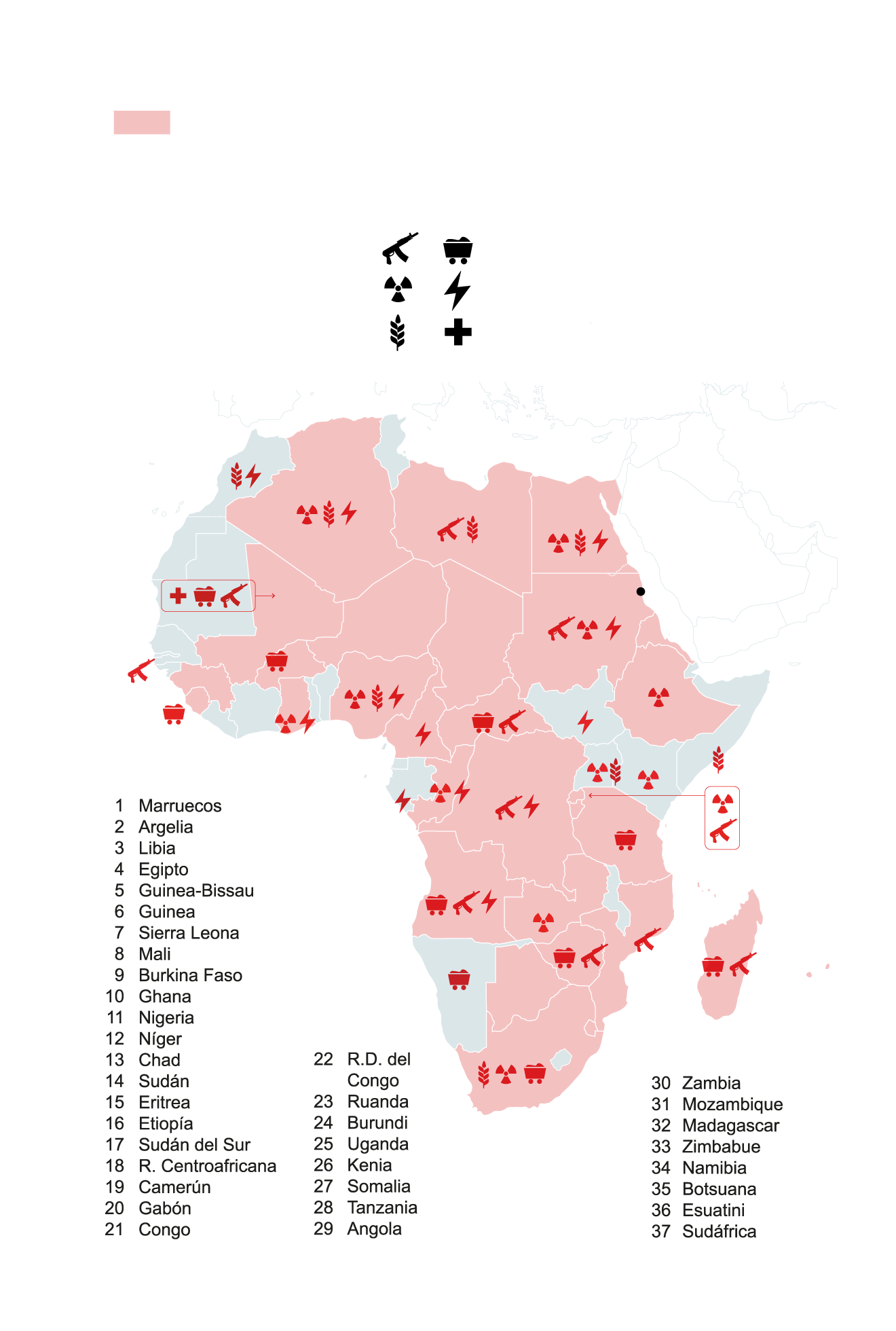 Con fondo rojo los países que tienen firmados acuerdos de cooperación militar con Rusia (venta de armas, formación militar y o maniobras militares conjuntas)