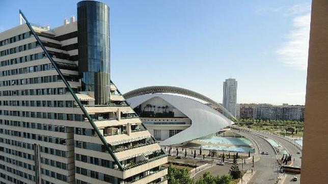 Lejos del centro histórico y de la playa, el hotel Meliá situado enfrente del Palacio de Congresos se erige como uno de los edificios más altos de toda Valencia.