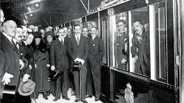 abc Su Majestad Alfonxo XIII (centro de la imagen) asistió a la inauguración de la primera línea de Metro de Madrid el 17 de diciembre de 1919. Le acompañaba, a su derecha, el director del proyecto, Don Miguel Otamendi. En la fotografía aparece el primer vagón de Metro de la línea 1, que comprendía las estaciones existentes entre Cuatro Caminos y Sol, más la ya desaparecida parada de Chamberí, actualmente un museo.