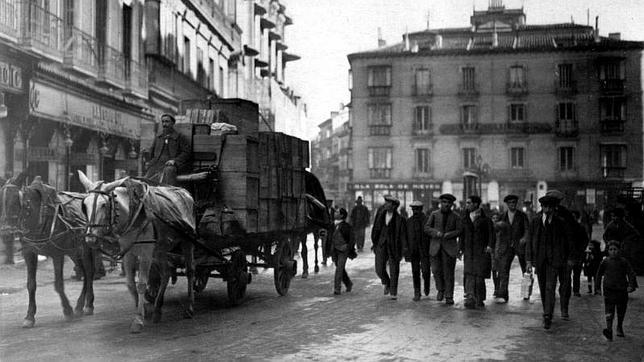 En enero de 1920 había escasez de tabaco en Madrid. En la imagen, recogida por ABC, se ve cómo un grupo de fumadores acompaña a un «camión» de tabaco, tirado por caballos, que va de camino al estanco de destino.
