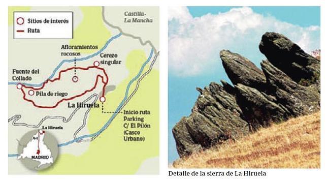 ABC Esta breve y cómoda excursión (se termina en sólo una hora, unos 3 kilómetros en total) transita por una pequeña senda marcada en la roca por el paso de las caballerías que transportaban a la eras las cargas de cereal. El recorrido parte de el aparcamiento a la entrada del pueblo de La Hiruela, donde hay un monolito que señala el principio de la senda. Por el camino se pueden observar las principales especies de matorral de la zona, compuesta por cambrones, cantuesos y botoneras y disfrutar del aroma de la abundante mejorana.