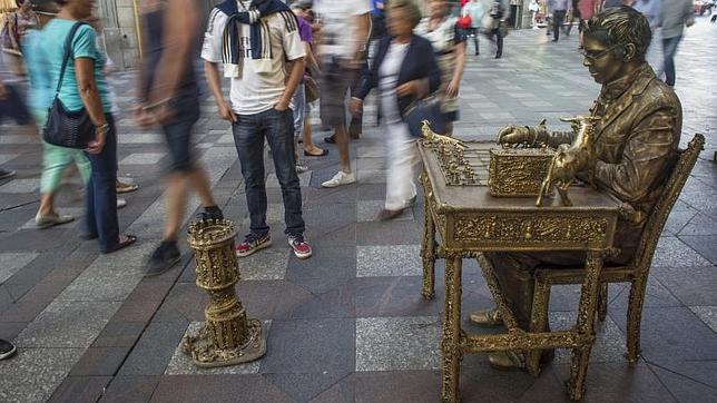 isabel permuy Un experto tarda entre diez minutos y dos horas en convertirse en estatua humana. Se realiza la transformación en la calle. «Normalmente para los que más tiempo se de dedica es para los de los festivales. En la calle hay que cambiarse rápido», indica Aguado. En la imagen, Jorge, «El hombre del ajedrez», quien lleva un año convertido en estatua en el centro de la capital. Vive cerca de las calles donde se instala, así que se prepara en su casa.
