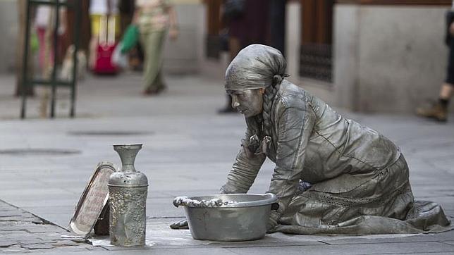isabel permuy Es la media de lo que puede obtener una de estas estatuas humanas durante seis u ocho horas en la calle al día. Los profesionales le dedican menos tiempo, entre cuatro y cinco horas. En la imagen, Moisés, «El hombre del tiempo», el chileno que lleva un lustro dedicándose a este tipo de arte en las calles de Madrid. En su país ya lo practicaba.
