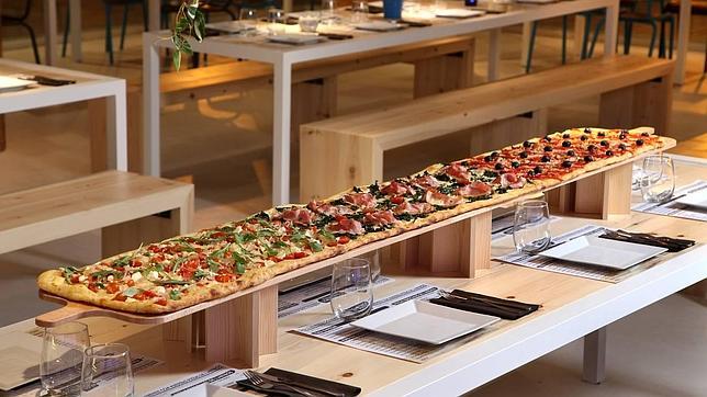 El restaurante reta a sus clientes a comer pizzas de hasta dos metros de longitud, o a comer una pizza del tamaño de la altura del comensal.