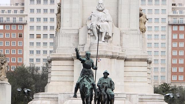 La estatua de Don Quijote y Sancho Panza, realizada por el tercer centenario de la publicación de la segunda parte de «El Quijote» en 1915, se ubica frente a los edificios de Torre de Madrid y Edificio España.