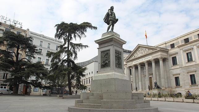 El monumento fue instalado en 1834, junto al Congreso de los Diputados. En 2009, al mover la estatua por unas obras, se descubrió una cápsula del tiempo bajo el pedestal que albergaba cuatro tomos de «El Quijote», una biografía del escritor y monedas de la época entre otros objetos.
