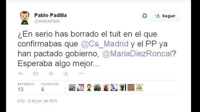@maesepads Hace unos días Pablo Padilla, diputado en la Asamblea de Madrid, increpaba a María Díez Roncal, candidata a la Comunidad de Madrid con Ciudadanos, que hubiese borrado un tuit tras un intercambio de opiniones entre ambos en la red social.