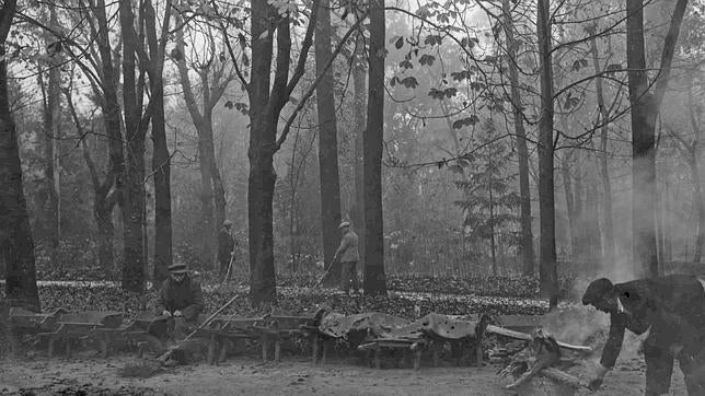 Los leves claroscuros, junto a las hojas maduras, escenifican de un vistazo el otoño. Aunque en este caso se trata de una imagen de fuera de la ciudad de Madrid, concretamente de Aranjuez, el jardín encuadrado es en sí mismo una estampa extraordinaria de esta estación. En la fotografía, tomada en 1920, el Jardín del Príncipe inundado de hojarasca.