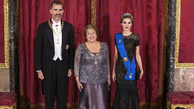 Doña Letizia ha deslumbrado esta semana en el Palacio Real, donde ha estrenado otro vestido largo de la firma Carlona Herrera. Los Reyes han recibido a Michelle Bachelet en la que ha sido la primera cena de gala que han ofrecido como Monarcas y Doña Letizia ha deslumbrado con un vestido ceñido negro que combinaba transparencias y encaje. FOTO: AFP PHOTO / POOL / ANDRES KUDACKI