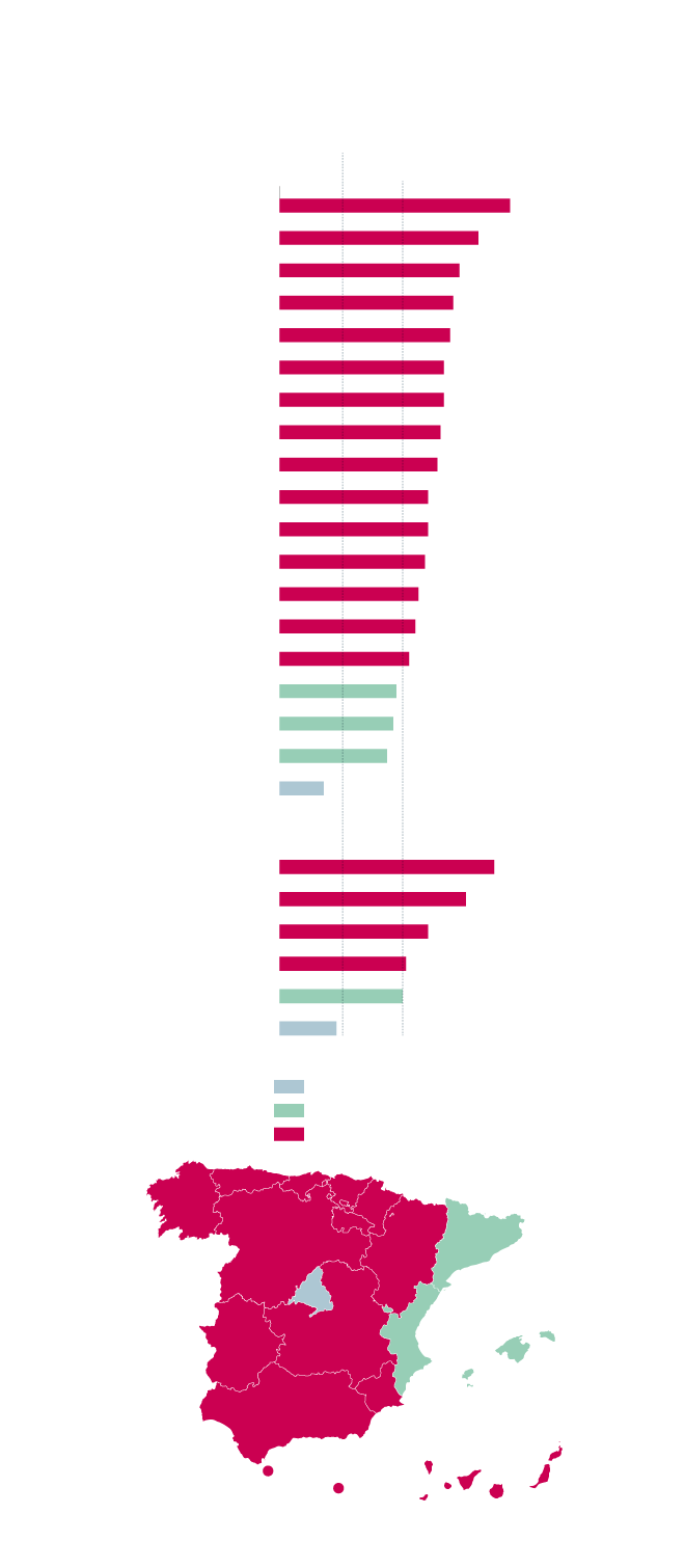 La Comunidad Autónoma con el parque móvil más joven de España es Madrid con 11,4 años de media, hecho relacionado probablemente con ser la ciudad donde más vehículos nuevos y electrificados se venden. Está seguida de Cataluña (13,4) y de la Comunidad Valenciana (13,6). En el extremo opuesto se encuentran Melilla (17,3), Ceuta (16,3) y Canarias (15).