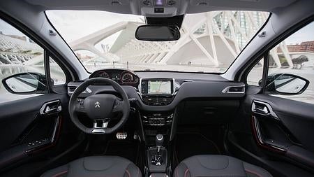 Dentro, umbrales de puerta fabricados en acero inoxidable con la inscripción Peugeot grabada, pedales de aluminio y alfombrillas con bordes rojos, instrumentación con cerco LED rojo, pespuntes de ese mismo color en los asientos delanteros, la banqueta trasera, apoyabrazos de puertas, fuelle y pomo del cambio, empuñadura del freno de mano y volante, cinturones de seguridad con los ribetes rojos que adornan los tiradores de las puertas delanteras...