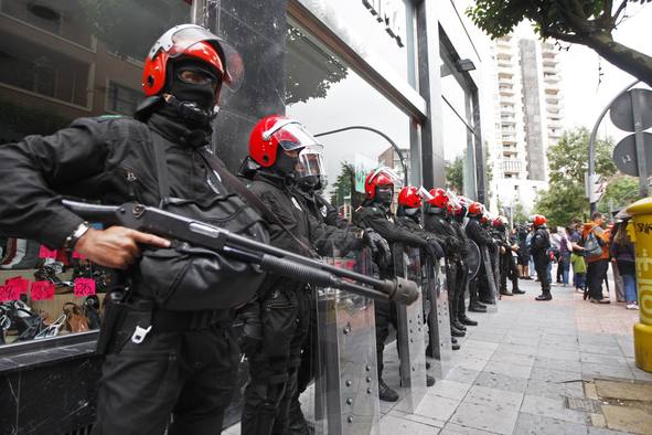 La Ertzaintza, momentos antes de disolver la manifestación hoy de Bilbao