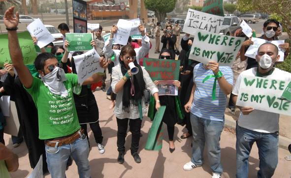 Simpatizantes del ex primer ministro Mir Husein Musaví portan pancartas con el mensaje "¿dónde está mi voto?" durante una protesta celebrada a las afueras de la embajada de Irán en Kuwait, hoy miércoles 17 de junio. Los simpatizantes de la oposición iraní piden la anulación de los resultados de las elecciones presidenciales del pasado viernes, que considera fraudulentas. Musaví se autoproclamó ganador de los comicios presidenciales del pasado viernes.