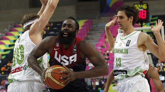Siete puntos. Esa fue la diferencia al final del segundo periodo. Eslovenia, y no es para menos, se fue orgullosa al vestuario, pero nada más pisar el parqué en el tercer cuarto reparó en la marcha más que Estados Unidos tenía reservada. Los grandes equipos tienen estas cosas. Así, James Harden, que hasta el momento había deambulado inédito por la pista, reparó sus nefastos números anotando casi todo lo que se jugó. Sus doce puntos hundieron al rival, que asistió resignado al festival que también propiciaron Davis y Thompson (máximo anotador del cruce con 20 tantos). Esta vez no hizo falta la mejor versión de Curry, pero para compensar Derrick Rose se reconcilió con el aro y firmó doce puntos. Si vuelve definitivamente, el exterior de los Bulls puede aportar muchísimo.