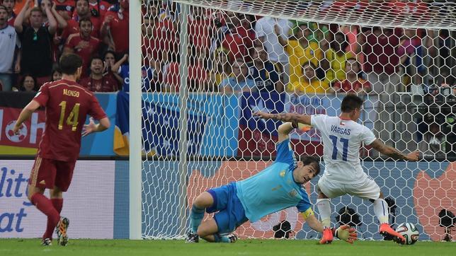 España ya había dispuesto de una ocasión para adelantarse en el marcador, pero fue Vargas el que consiguió el primer tanto del partido. El delantero se coló en el área aprovechando un fallo defensivo, quebró a Casillas y anotó el 0-1 para poner en muchos problemas a España, que deberá remontar.